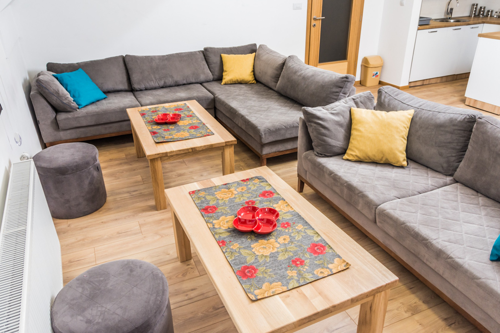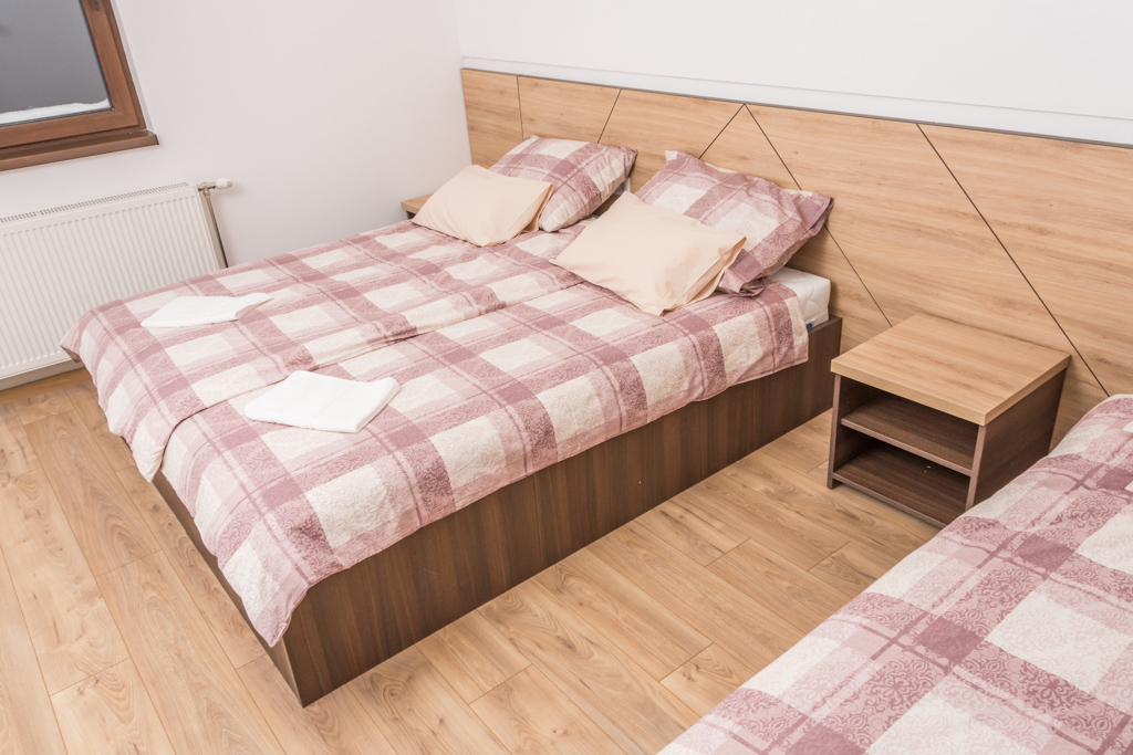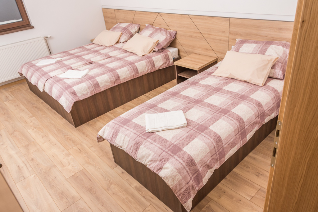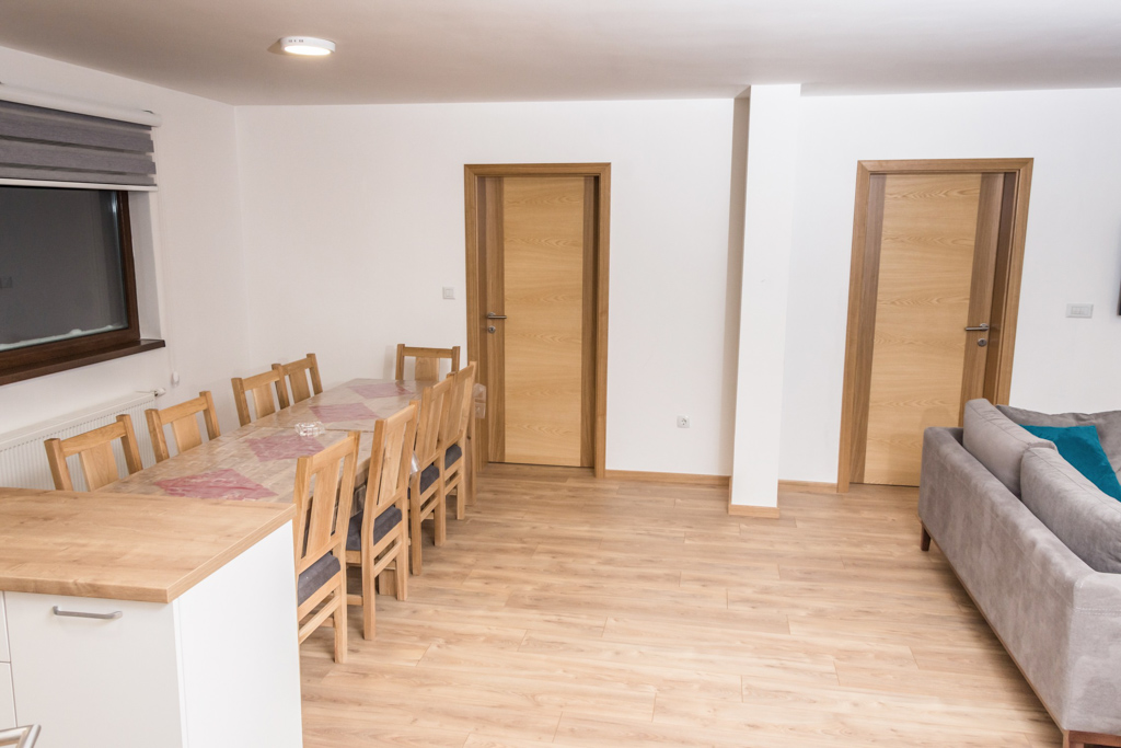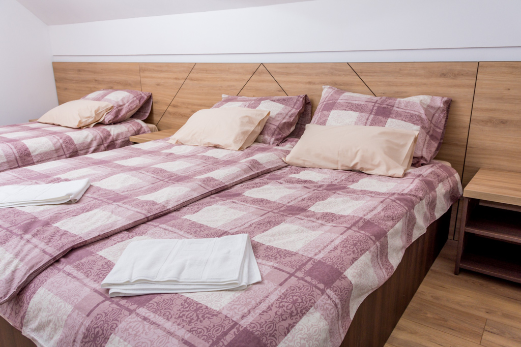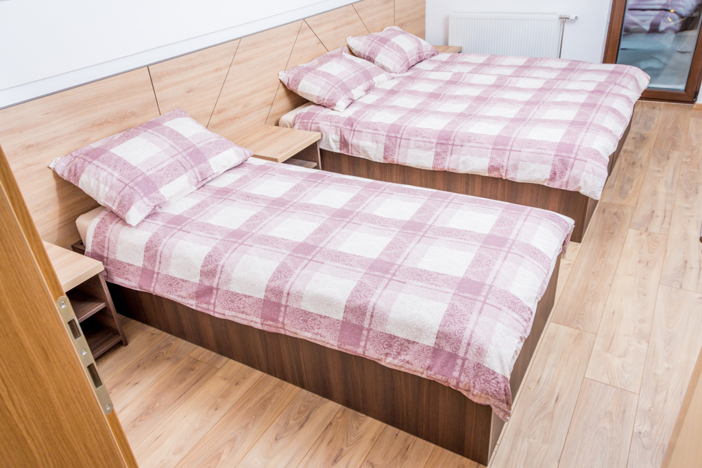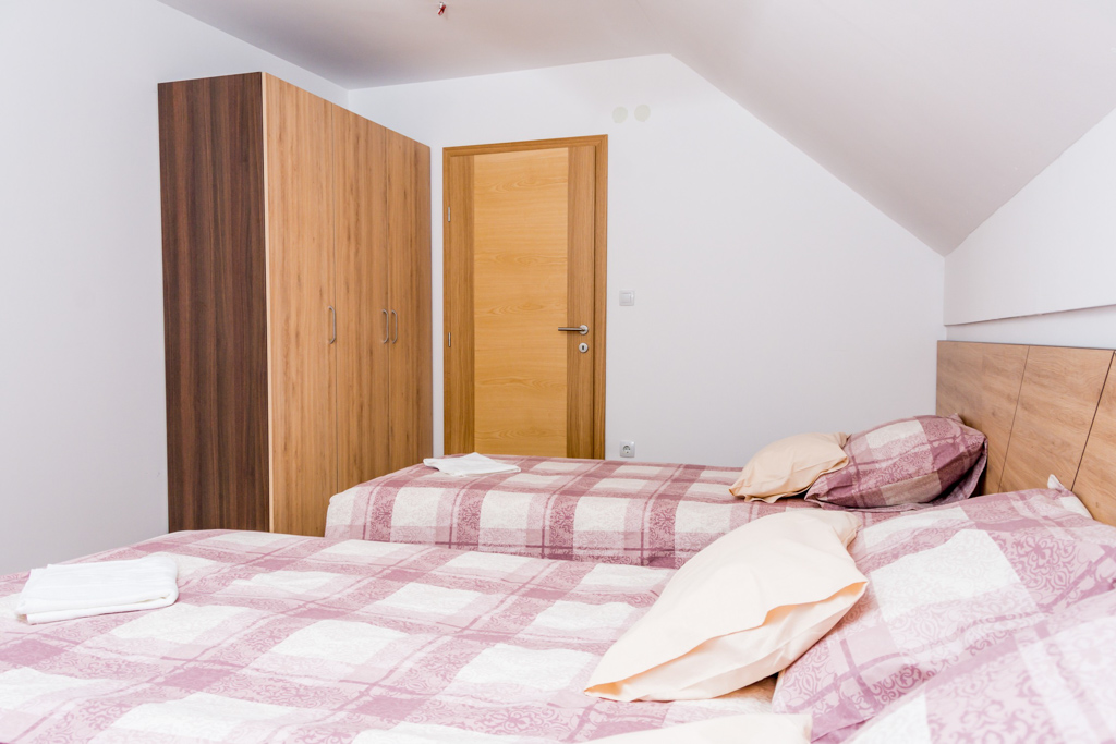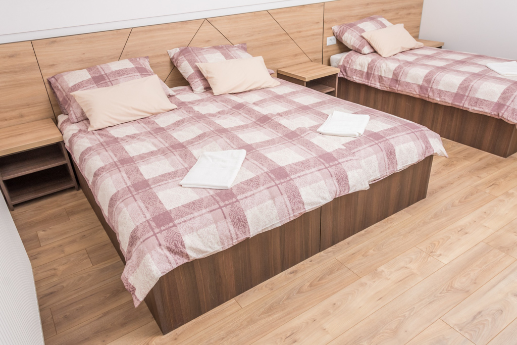 Apartment 6 consists of a living room, kitchen, bathroom, hallway and 3 rooms. The total area is 97 m2. All rooms have a double bed and a single bed, so you can make 3 single beds in each room.