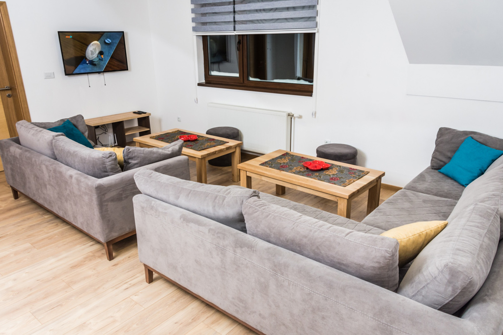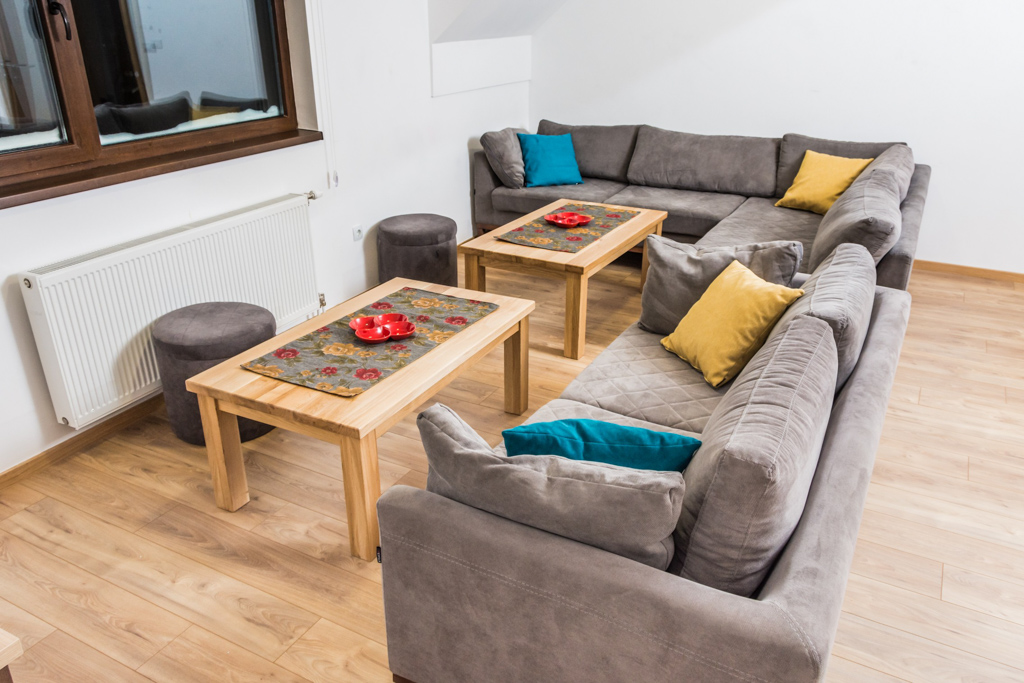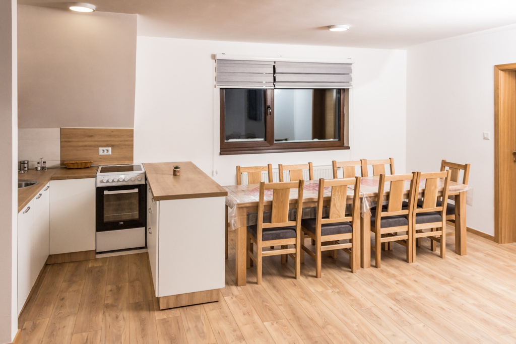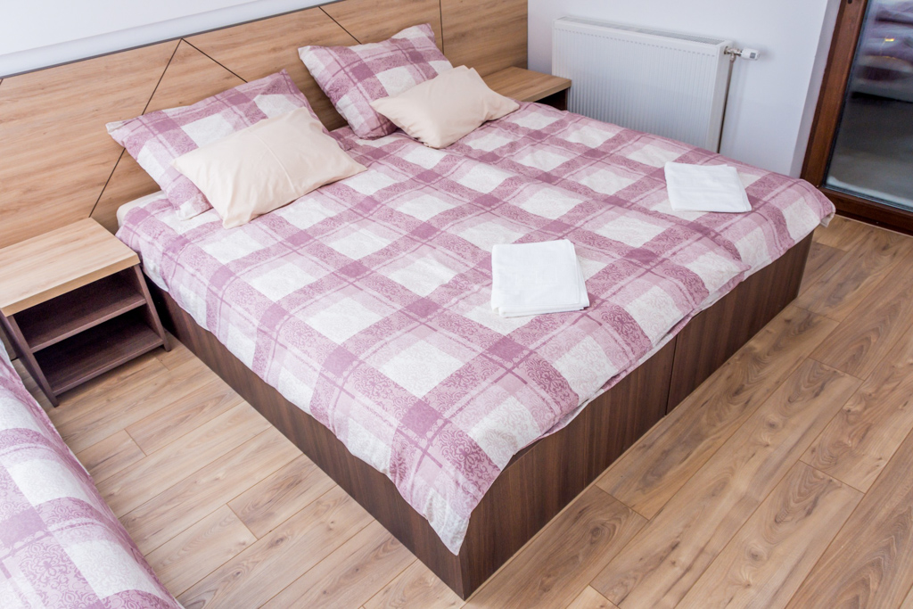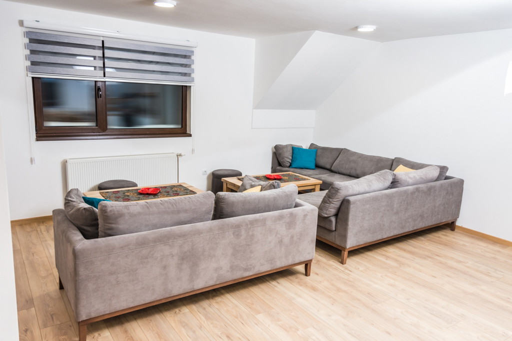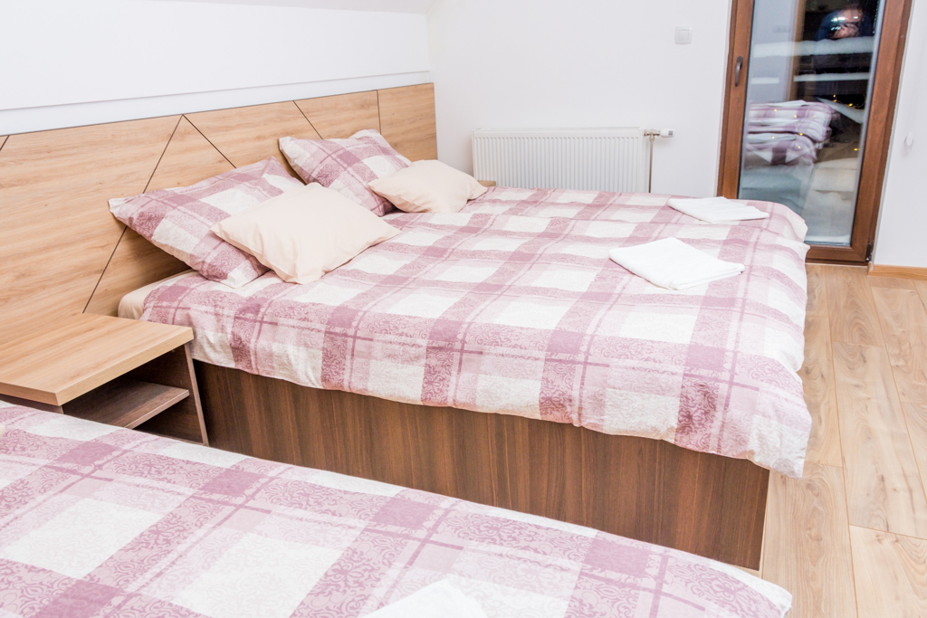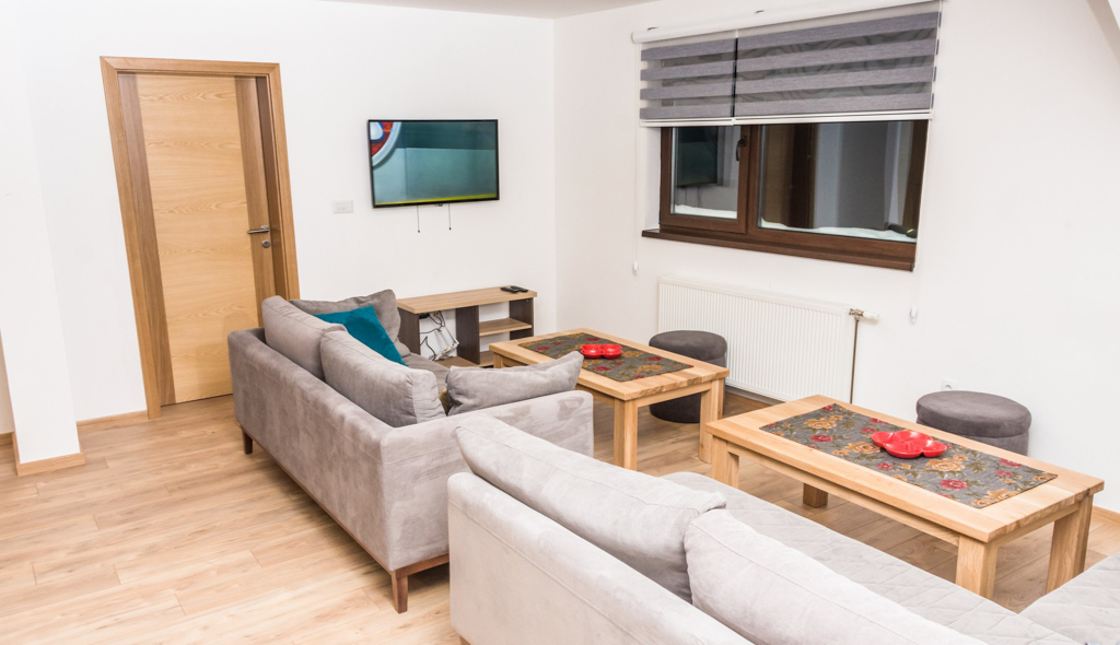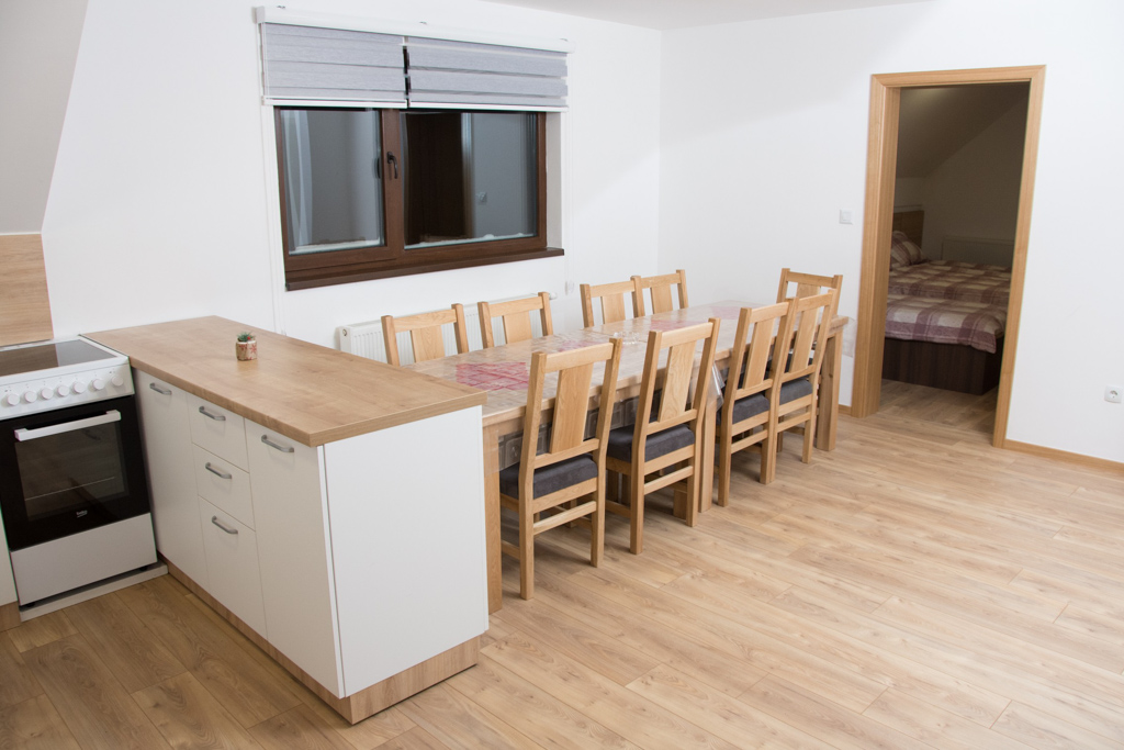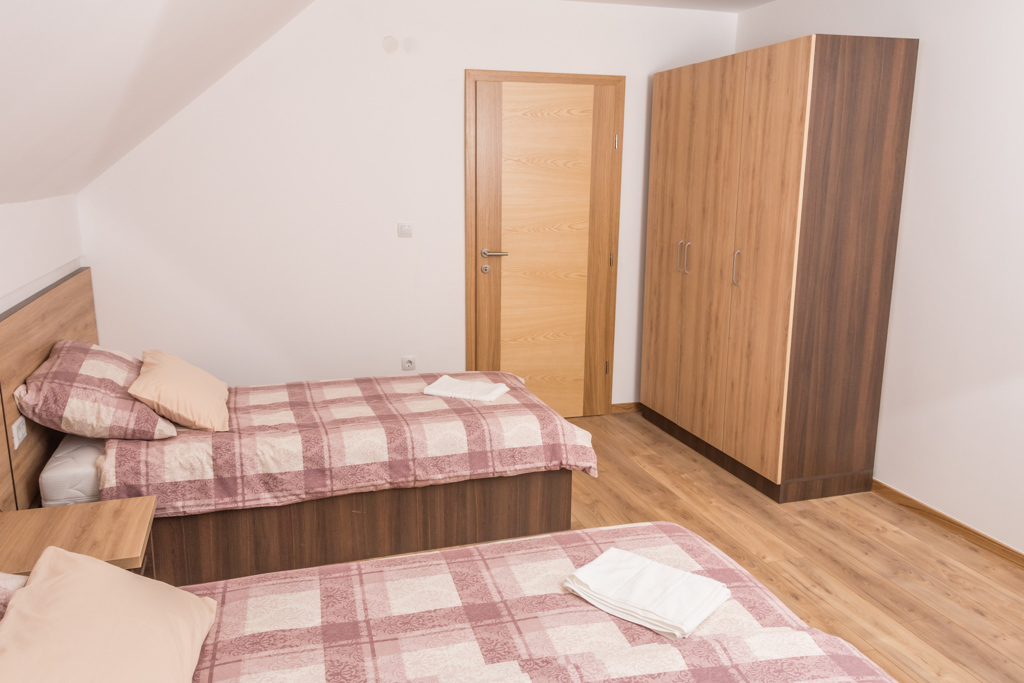 Apartment 6 consists of a living room, kitchen, bathroom, hallway and 3 rooms. The total area is 97 m2. All rooms have a double bed and a single bed, so you can make 3 single beds in each room.